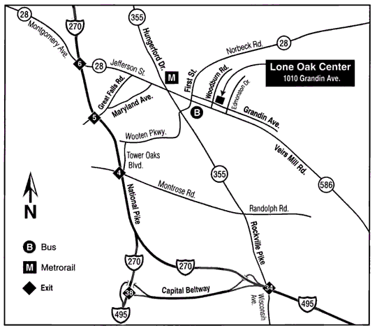 Here is a simple map you can print off as a reference. Note that the Rockville Metro Stop is at the corner of Hungerford Drive (MD route 355) and Jefferson Drive (MD Route 28). It is a short walk to the Lone Oak Center. The YAHOO! Map service lets you change the scale and request personalized driving directions. (If you get driving directions, remember to review them carefully to verify that they "make sense"! Computer-generated directions sometimes go astray.)