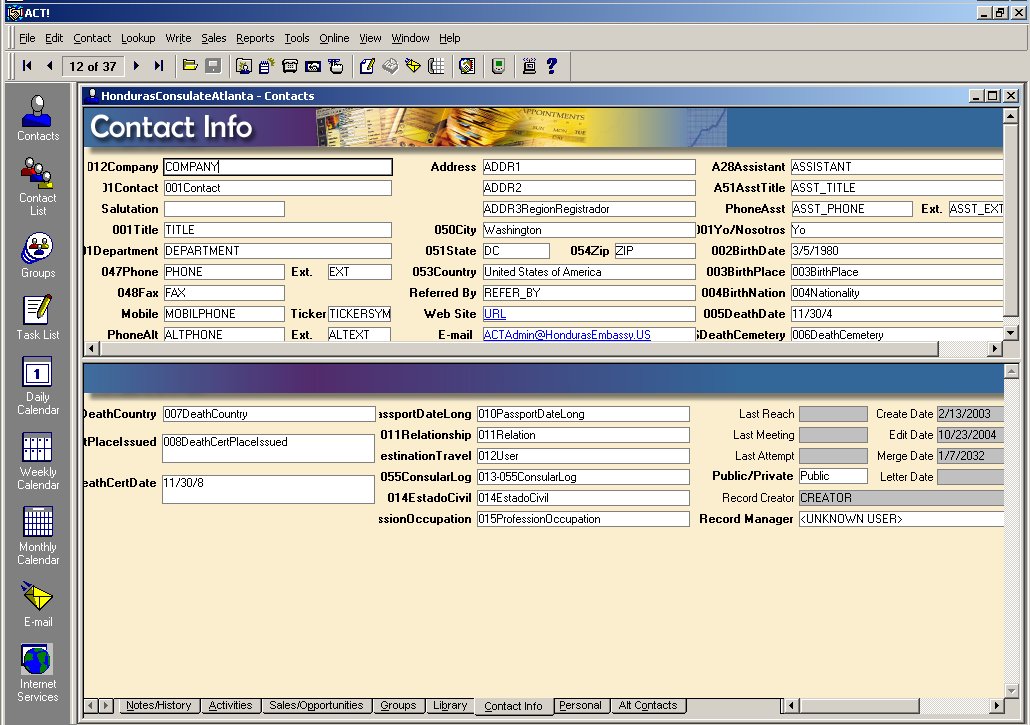 File Open to look for the Consulate DBF At the main screen of ACT! you may find yourself in the Demo database ACT! provides a start up demo with the name Chris Huffman - the "Joe Customer" of ACT! |